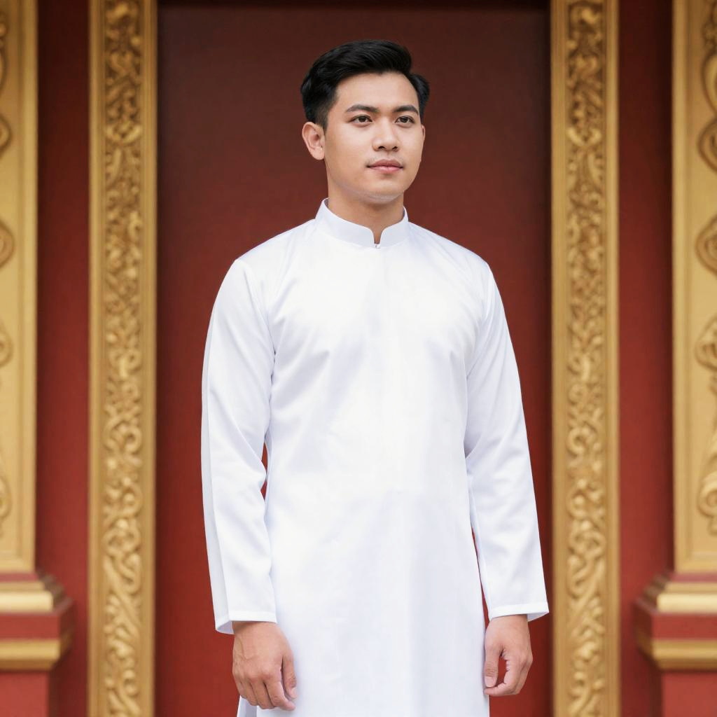Vietnamese Wedding Man Clothing, man in a white wedding dress standing in front of a red and gold wall