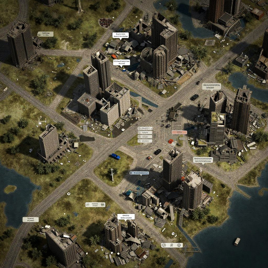 Map AI generator producing a post-apocalyptic survival map with ruined cities, safe zones, and resource locations, gritty textures and desaturated color palette conveying a desperate atmosphere, scattered debris and collapsed structures.