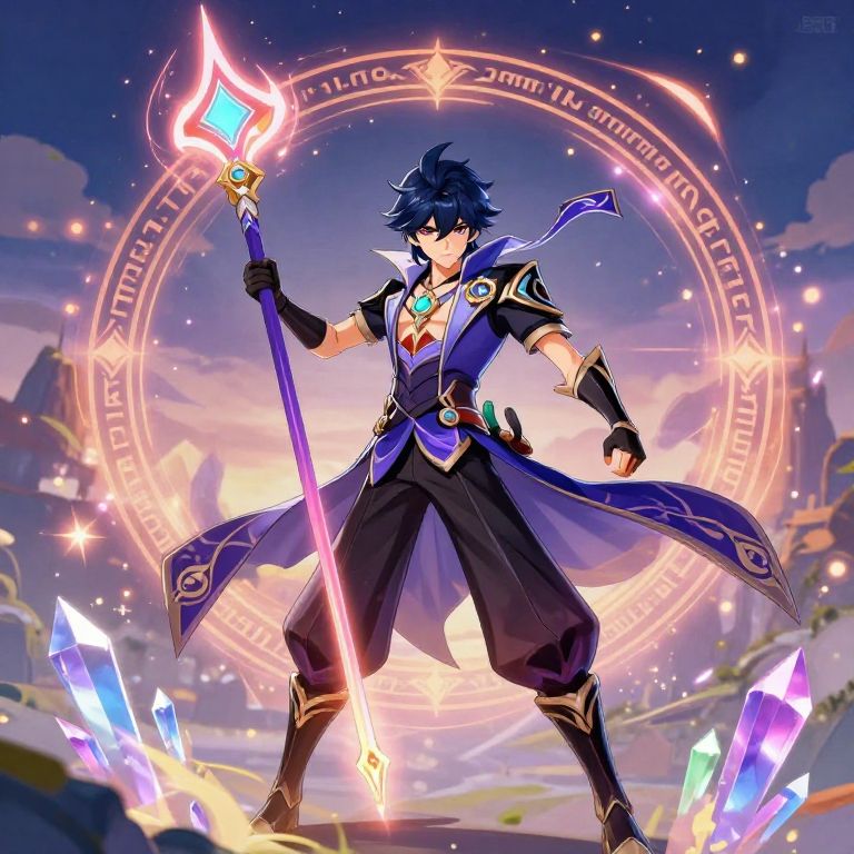 Genshin Impact OC base showing a powerful mage character wielding a glowing elemental staff, surrounded by swirling magic particles and ancient runes, atmospheric twilight setting with floating crystals, sharp character design, colorful and immersive background