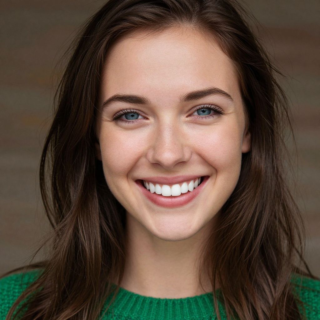 Close-up photo of a smiling woman with fair skin and long, dark brown hair. Her eyes are bright blue, and she's wearing a green, textured sweater. Her teeth are perfectly white and straight. The background is blurred with earthy tones, making her face stand out. She has a joyful expression, and her hair is slightly tousled. The image has a soft, natural light.
