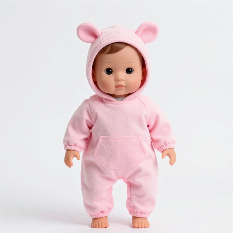 Photograph of a realistic baby doll with light skin, brown hair, and black eyes, wearing a pink hooded onesie with bear ears on top. The onesie has a front pocket and is slightly loose, with the sleeves and legs slightly baggy. The doll stands barefoot on a white background, facing forward. The fabric of the onesie appears soft and slightly shiny, with subtle texture details. The overall style is cute and childlike, with a focus on comfort and warmth.