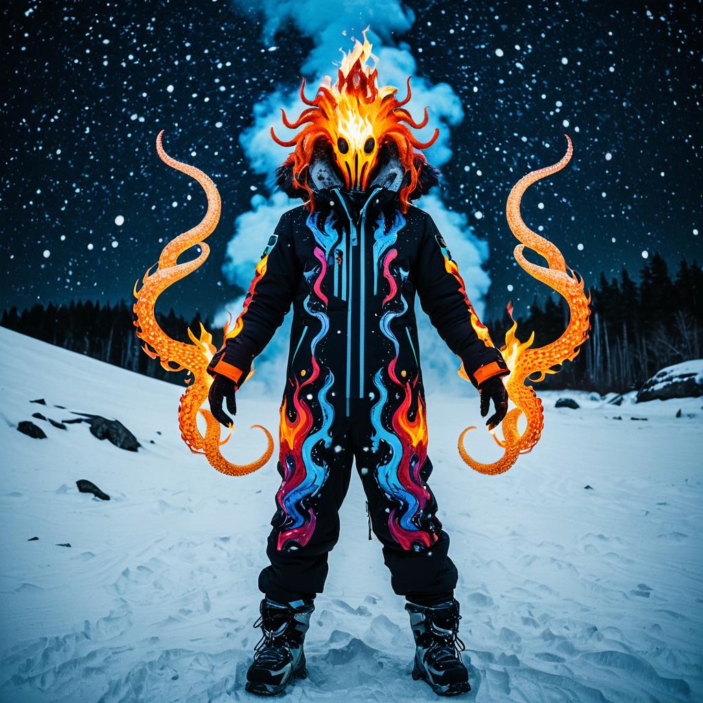 Full-body view of a person in a neo-fauvist style fire and ice elemental costume standing on a snowy landscape at night. The outfit features bright, flame-like patterns and a fiery mask resembling burning hair and eyes, contrasted with cold, icy elements. The background shows a starry sky with snowfall, adding to the mystical and surreal atmosphere.