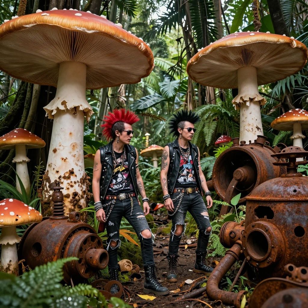 Nature punk aesthetic capturing a chaotic jungle scene with punk fashion rebels weaving through giant mushrooms and rusted machinery, intense colors, sharp contrast between natural decay and punk culture