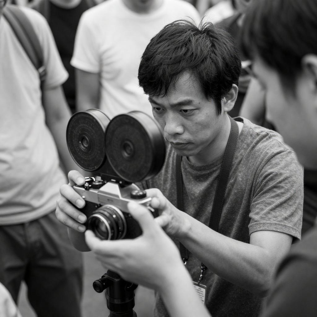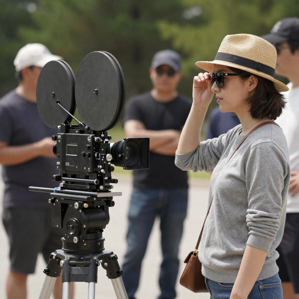 Photograph of a film set. Woman in gray sweater and straw hat, adjusting her sunglasses, standing to the right. Film camera with various attachments on a stand in front. Background includes several people, some wearing baseball caps, standing and talking. Bright daylight, green trees visible in the distance. Woman's profile, focused expression. Film equipment, including a wheel and a lens, positioned in the foreground.