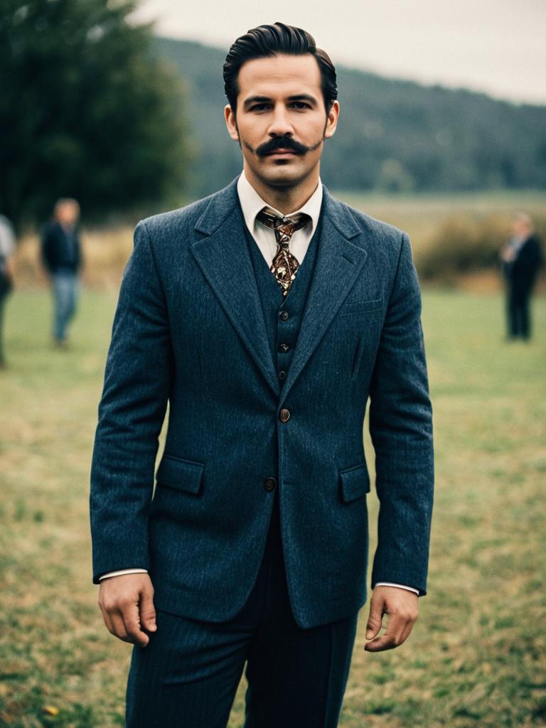 Top male costume, 1boy, male focus, solo, facial hair, mustache, blurry, outdoors, blurry background, full body, standing, day