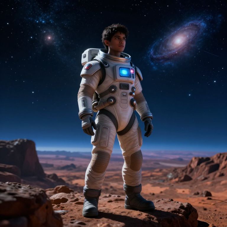 Photorealistic CGI image of a young man in a white, bulky space suit with a blue-lit chest panel, standing on a rocky, reddish desert planet. His suit has black accents and a large backpack. The background features a starry night sky with a bright galaxy and distant mountains. The horizon shows a gradient from dark blue to light blue. The man has short, dark hair and a neutral expression, standing confidently with his hands by his sides. The scene has a sci-fi, astronaut adventure vibe.