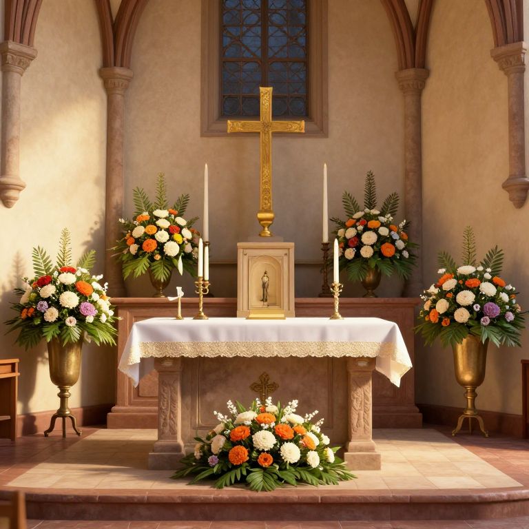 A beautifully rendered 3D render depicts a solemn altar prepared for the Whitsun procession in Rehringhausen, Olpe, Sauerland, North Rhine-Westfalia, Germany, featuring intricate floral arrangements, warm golden-hour lighting, and vintage architectural details.