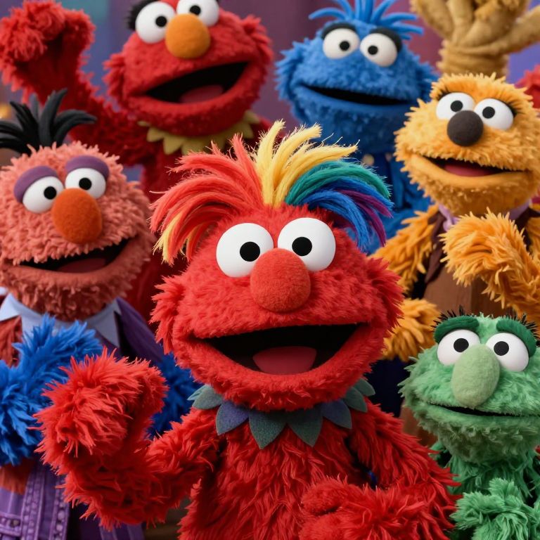 Photograph of colorful, fluffy Muppet-style characters from the "Sesame Street" series. Foreground features a red Muppet with a rainbow-colored mohawk and white, round eyes, waving with a cheerful expression. Surrounding him are various Muppets: a blue one with a top hat, an orange one with a brown bow tie, a green one, and others in different colors and styles. The background is blurred with vibrant, multi-colored hues. The Muppets have distinct, large, cartoonish eyes and orange noses, showcasing their playful, friendly demeanor. The textures are soft and fuzzy, enhancing their whimsical appearance.