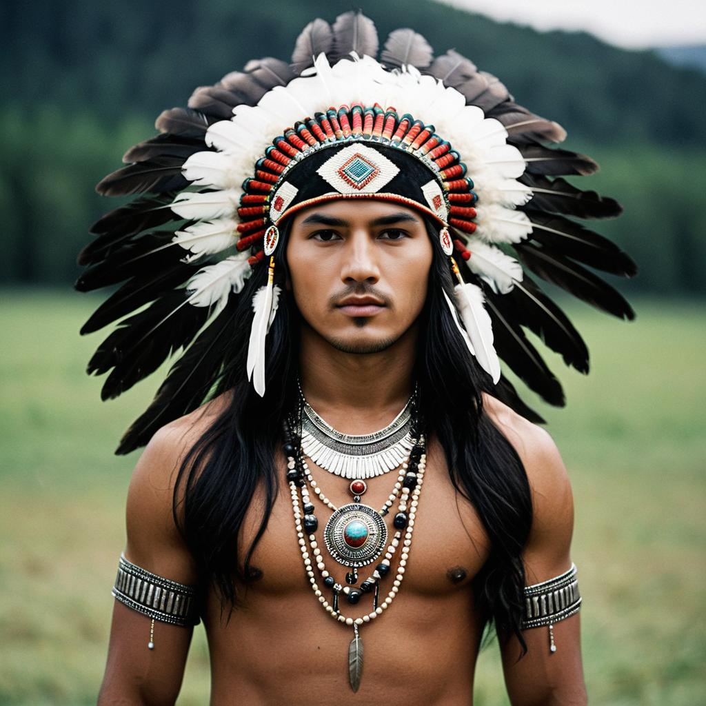 Boy chiefs outfit fancy ,solo, 1boy, male focus, long hair, black hair, blurry background, navel, jewelry, headdress, necklace, outdoors, blurry, feathers, looking at viewer