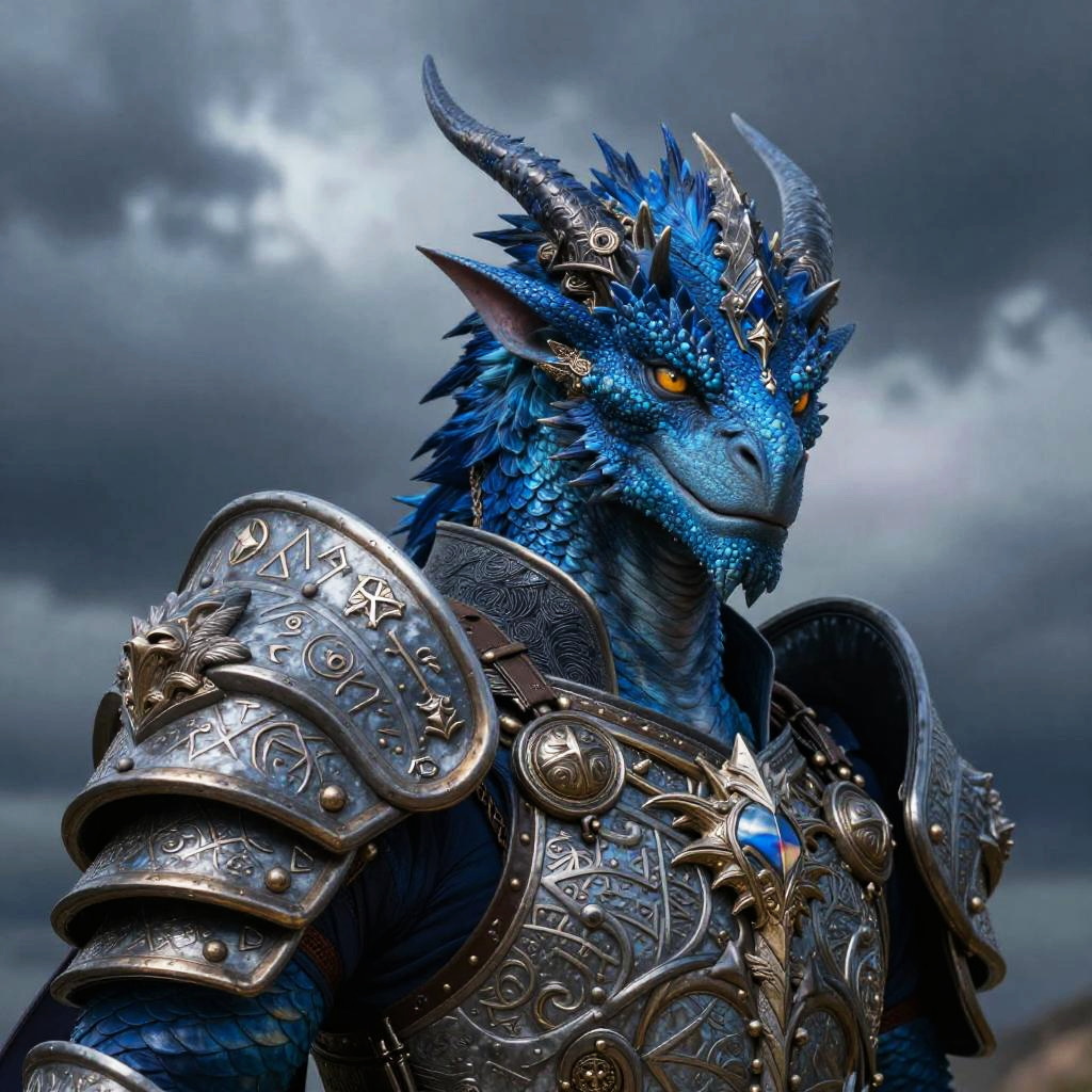 Blue dragonborn portrait, close-up of a regal dragonborn warrior with vibrant blue scales, dragon-like facial features, ornate battle armor adorned with ancient runes, set against a stormy sky, vivid color palette, hyper-realistic fantasy art style with dramatic lighting.