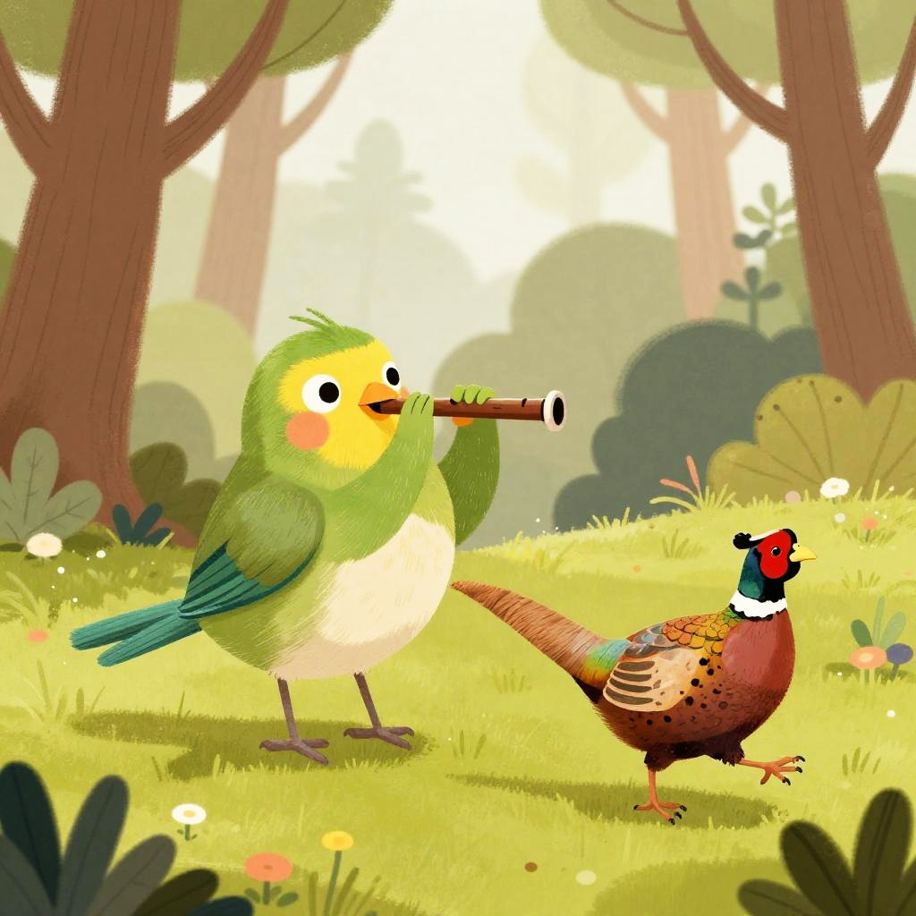 Partridge playing a flute and pheasant hopping along in a whimsical forest setting, playful and musical, illustrated in a charming style
