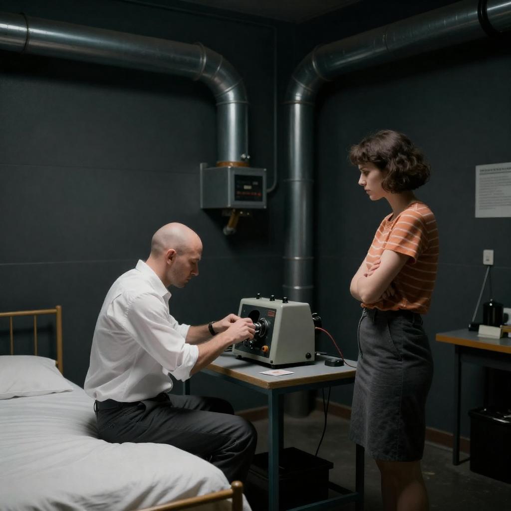 A dimly lit, industrial room with dark walls and metal pipes. A bald man in a white shirt sits at a small table with a bed beside him, working on a machine. A woman with short brown hair, wearing an orange striped shirt and gray skirt, stands with arms crossed, facing him. The room has a cluttered, utilitarian feel.
