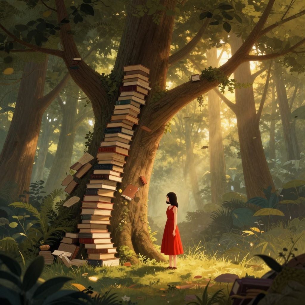 A serene digital illustration depicts a young woman in a red dress standing amidst a mystical forest, where a towering tree is adorned with a cascading stack of books, symbolizing the fusion of nature and knowledge, bathed in the ethereal glow of golden-hour lighting.