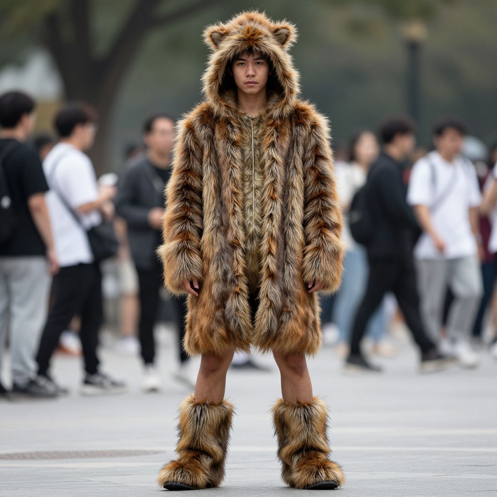 Photograph of an Asian woman standing outdoors on a paved area, wearing a full-length, brown and black striped fur coat with a bear hood and matching fur boots. The coat is thick and shaggy, covering her body completely. Her expression is neutral, and she stands with her hands by her sides. In the blurred background, several people are walking, dressed in casual modern clothing, creating a contrast with her wild, animalistic costume. The scene is urban, with trees and indistinct buildings in the distance. The overall style is avant-garde and bold.