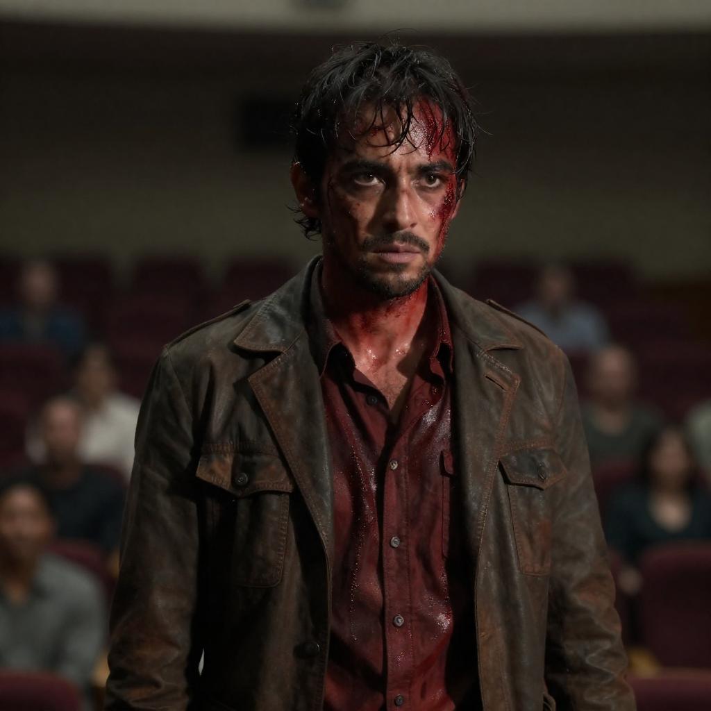 Portrait of a blood-stained man with wet, disheveled dark hair and intense facial expression standing in a dimly lit auditorium. He wears a dark brown leather jacket over a red shirt, both soaked with shiny blood. The blurred background shows a shadowy, seated audience with darkened seats, adding to the dramatic atmosphere.