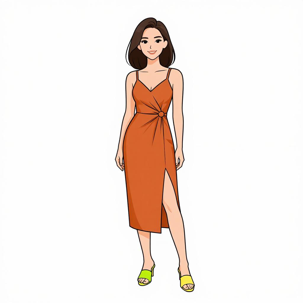 Woman with pretty face and pretty hair. smiling Woman, minimalist chic, sleeveless midi dress in burnt orange, V-neckline, front knot detail, spaghetti straps, straight silhouette, split hem, color-blocked open-toe mules with lime green and pale yellow straps, white studio background. --sref 1467