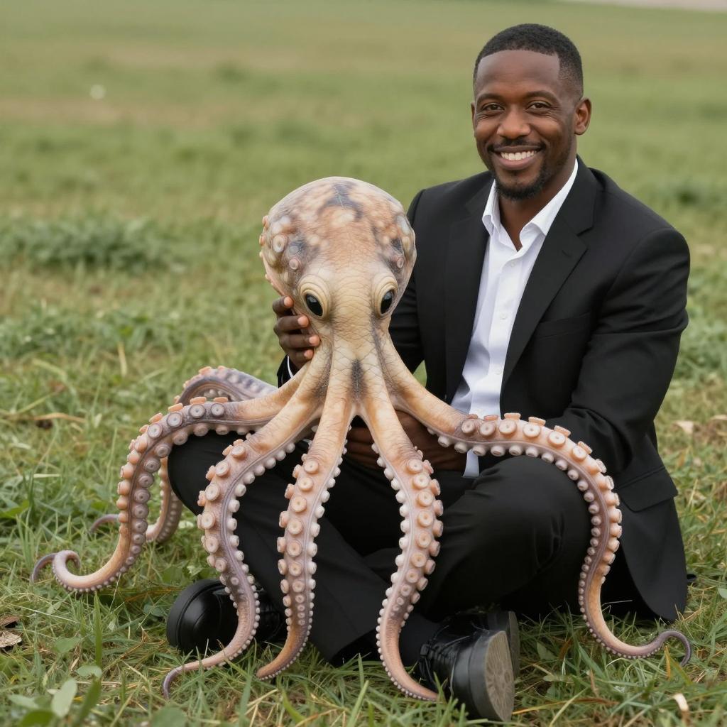 Portrait of a smiling Black man dressed in a black suit and white shirt sitting on green grass while holding a large beige octopus with multiple tentacles. The man looks directly at the camera with a friendly expression in an outdoor setting.