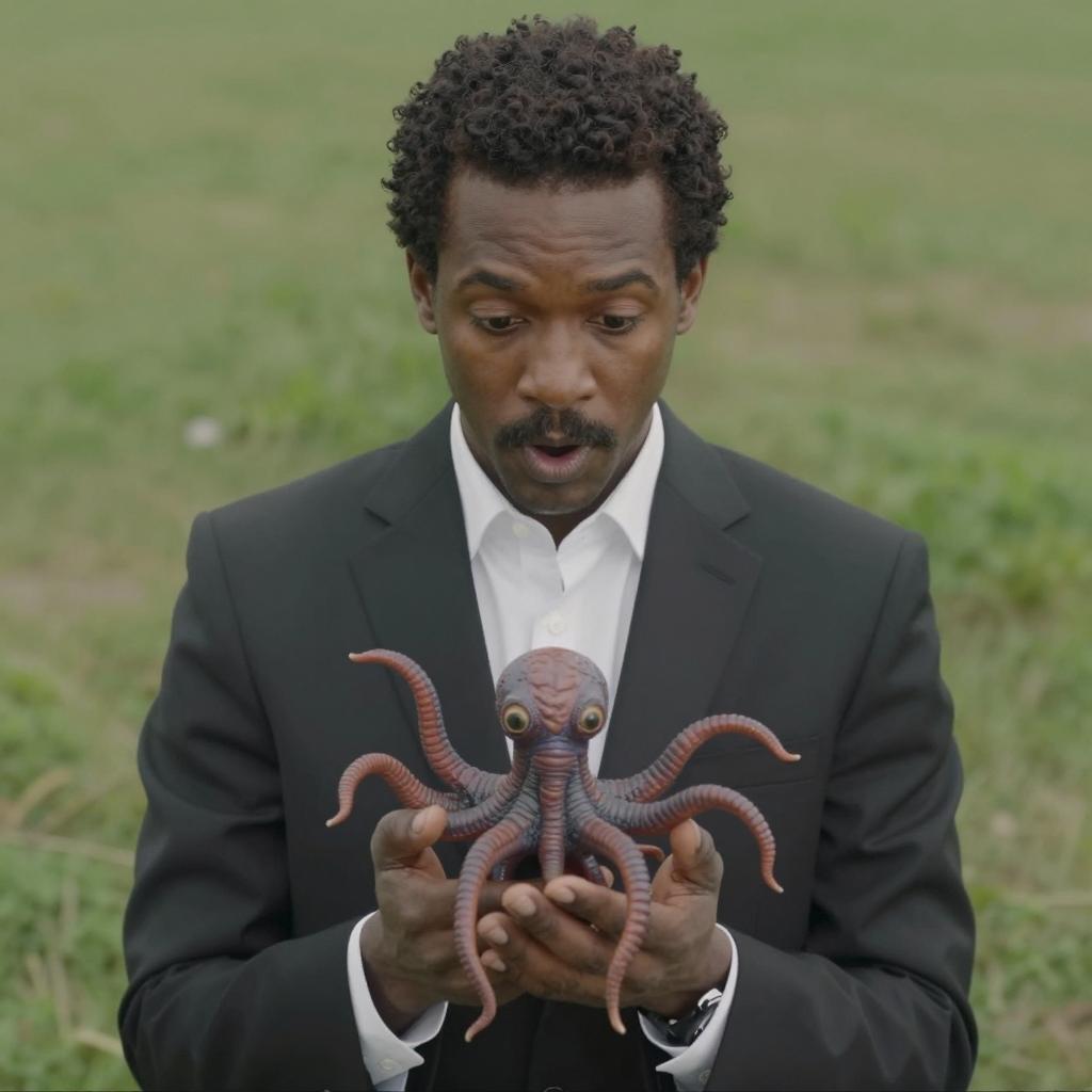 Photograph of a smiling black man in a black suit and white shirt holding a large, beige, multi-legged creature with tentacles. He sits on green grass, looking at the camera. The creature is in his hands, with multiple legs visible.
