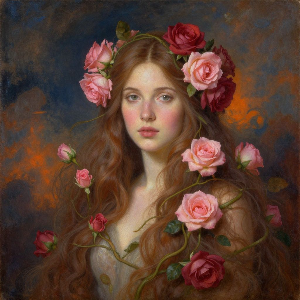 Digital painting of a blonde woman with green eyes, reflected in an ornate mirror, surrounded by glowing pink flowers and a blue flower. Ethereal,