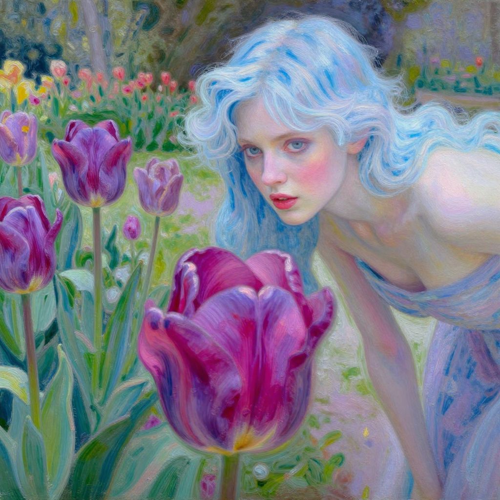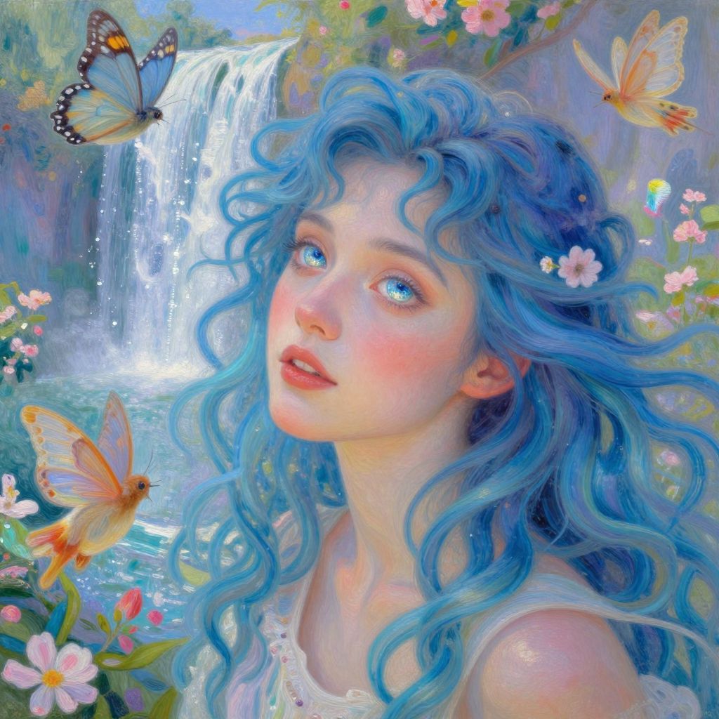 Digital painting of a blonde woman with wavy hair and green eyes gazing at her reflection in an ornate oval mirror. She wears a white, sleeveless top. The mirror is surrounded by vibrant pink flowers with glowing blue and purple petals. A single glowing blue flower hovers above her head. The background is dark with soft, ethereal light highlighting her face and reflection. The image has a dreamy, fairy-tale-like quality with rich, saturated colors and soft textures. The woman's expression is serene and contemplative.