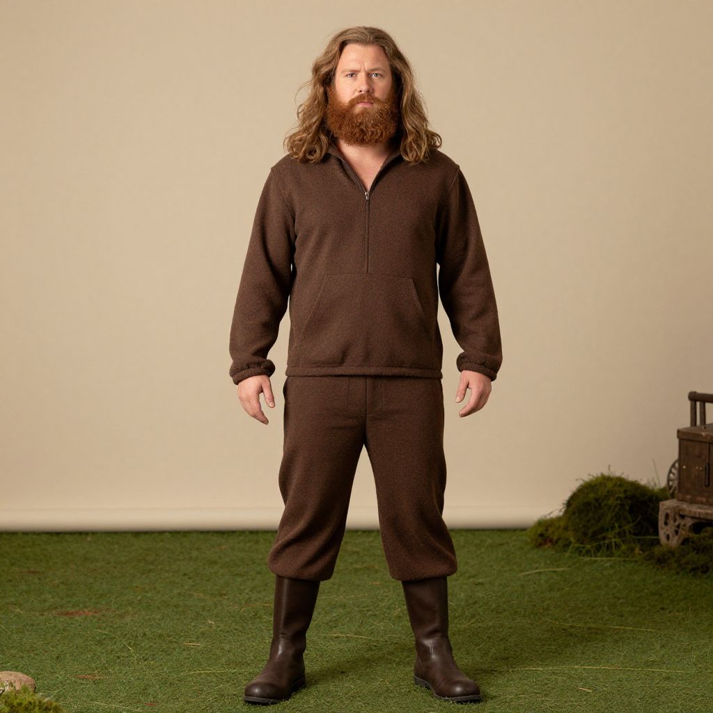 Photograph of a Caucasian man with long, wavy brown hair and a full beard, standing on a grassy surface against a plain, light beige background. He wears a dark brown, zip-up jumpsuit with a front pocket, and black boots. His expression is neutral, and his arms are relaxed at his sides. To the right, there's a small, rustic wooden structure with a thatched roof. The image has a slightly vintage, staged look, reminiscent of a historical or fantasy character portrayal.