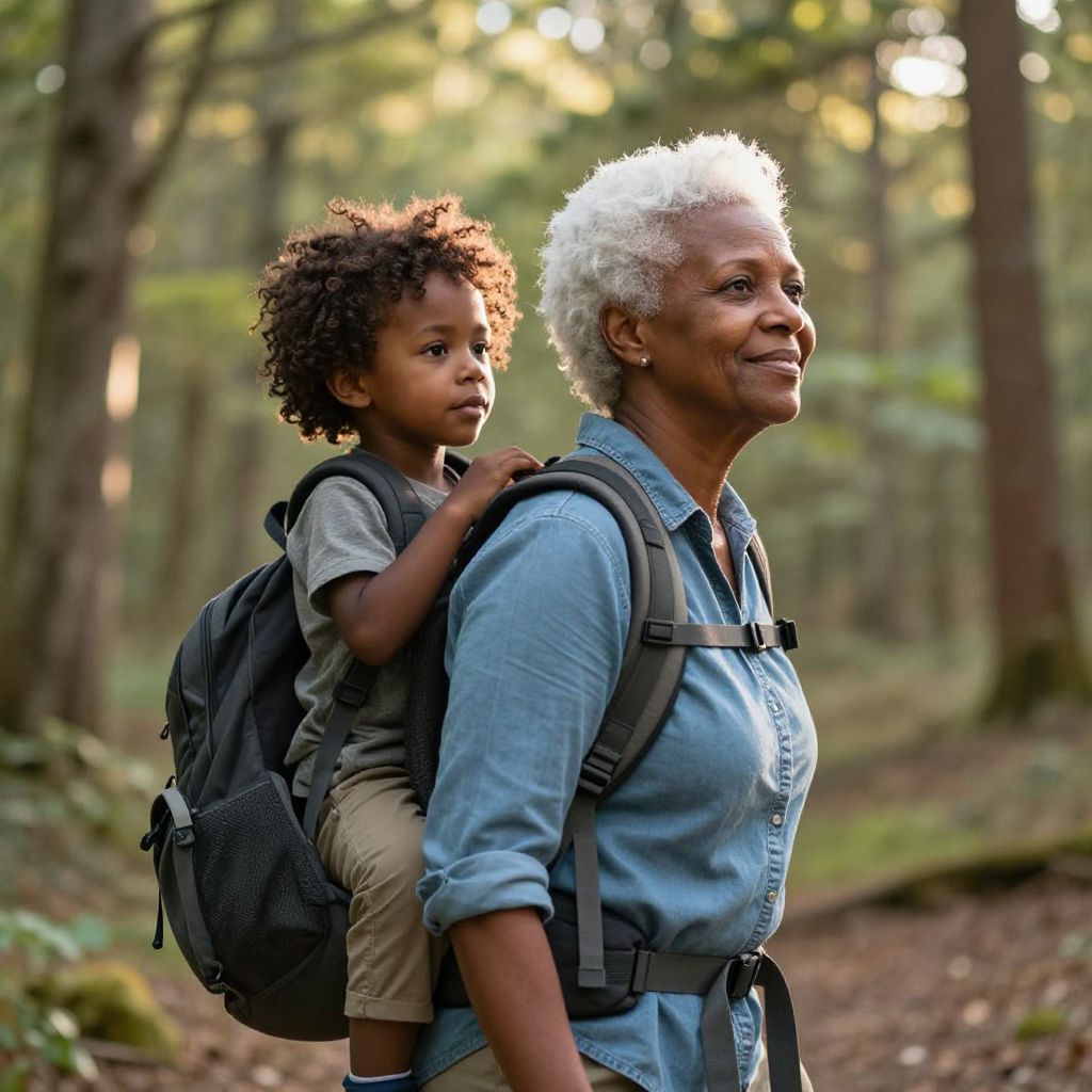 Photograph of an African-American grandmother with white curly hair, wearing a blue shirt, carrying a young boy with curly hair in a forest, both with