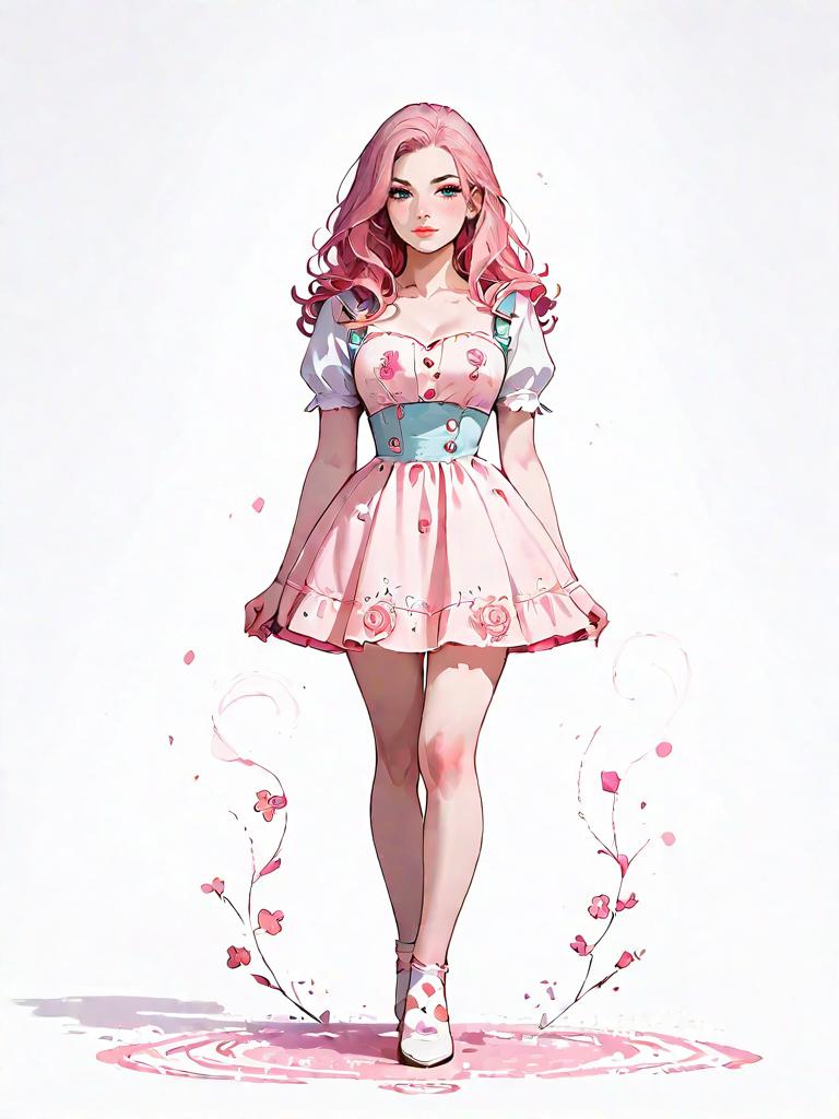 Digital artwork of a woman with long pink hair wearing a romantic summer pink floral mini dress with thin straps and a sweetheart neckline. The dress features a fitted bodice with central knotted detail, light ruching, and an A-line skirt with visible seam detail. The image is a full body shot with a white background and floral accents around her feet.