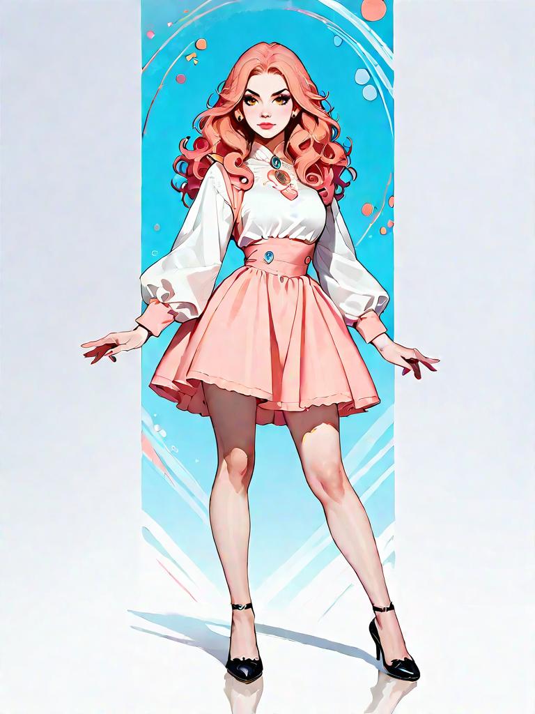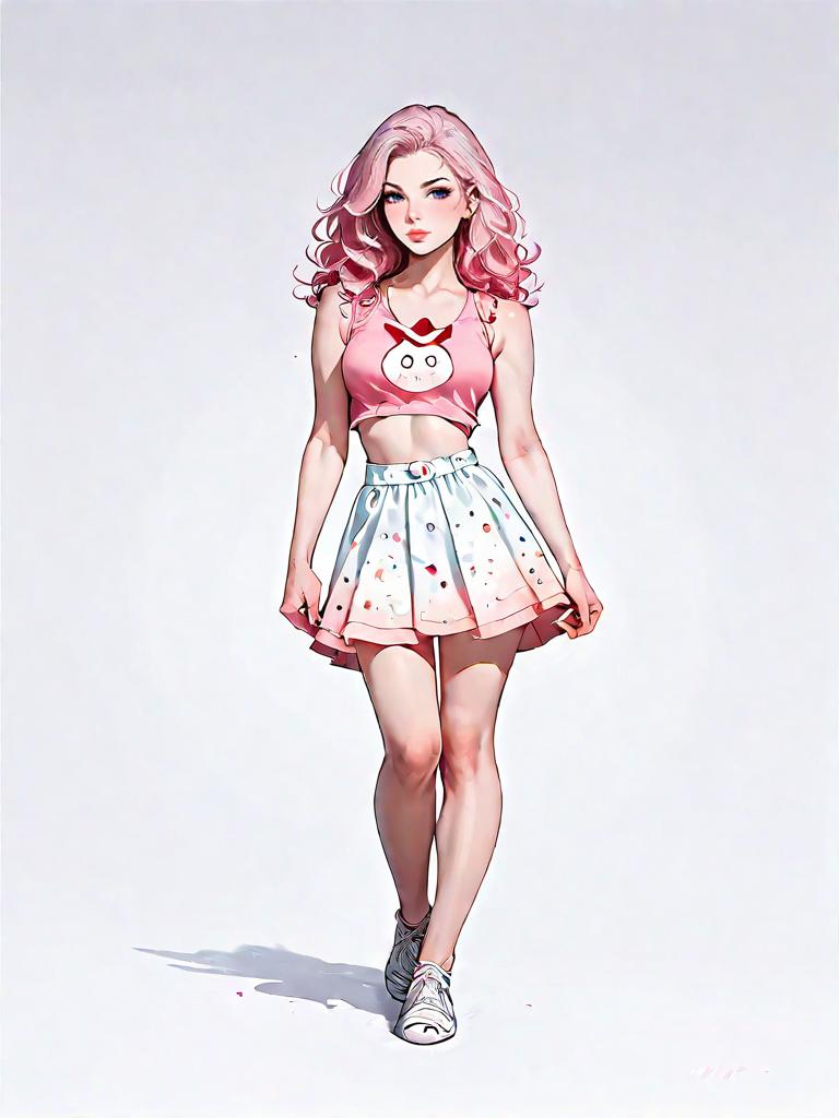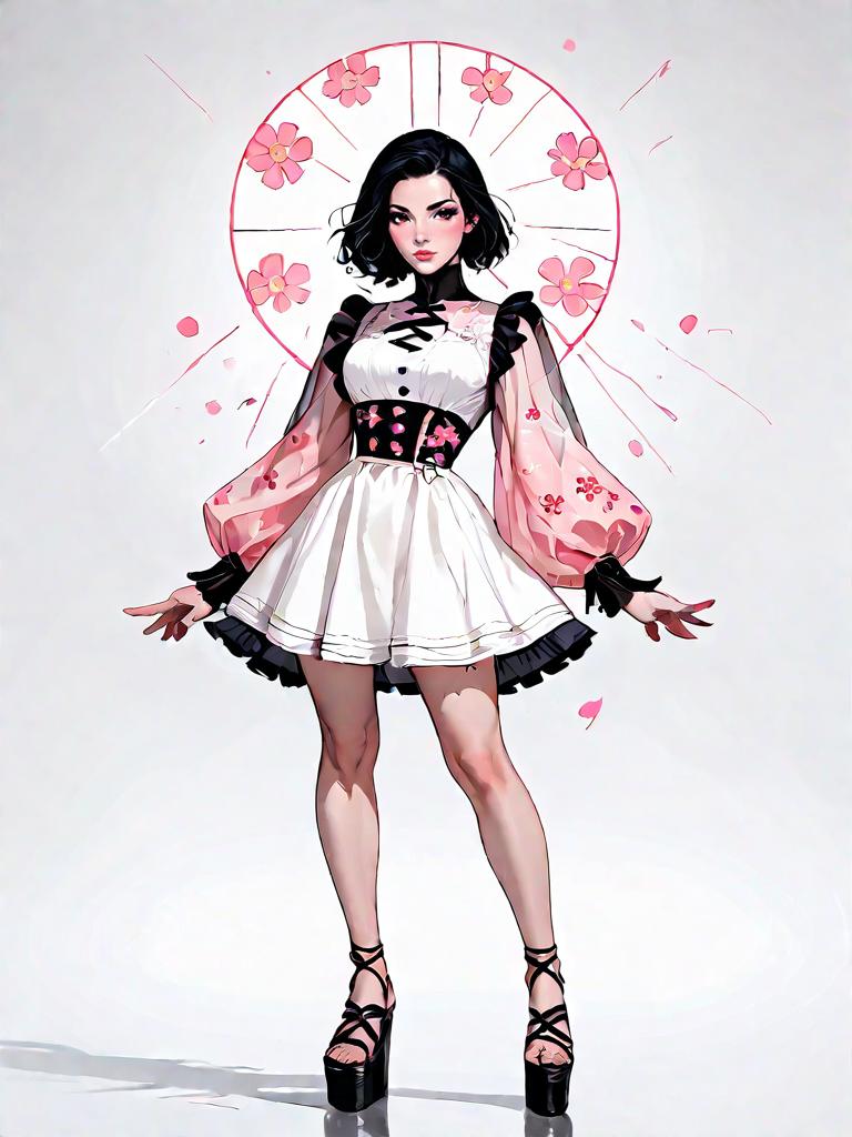 1girl, source_comics, realistic face, full body shot, Woman, romantic summer style, pink floral mini dress, thin straps, sweetheart neckline with a central knotted detail, fitted bodice, light ruching, A-line skirt, visible seam detail, white background.