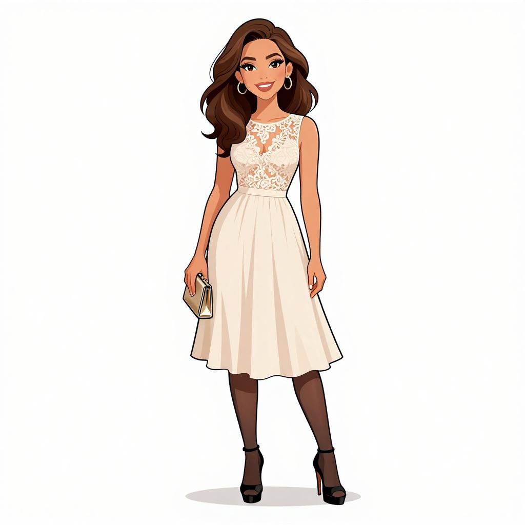 Digital illustration of a confident woman with long, wavy brown hair and light skin. She wears a yellow, V-neck, short-sleeved dress with a tied waist and a hem that ends mid-thigh on one side. She has large hoop earrings and black high-heeled sandals. She stands with a slight smile, one arm relaxed by her side and the other slightly raised. The background is plain white, making her the focal point. The style is modern, with bold lines and vibrant colors, emphasizing a chic, fashionable look.
