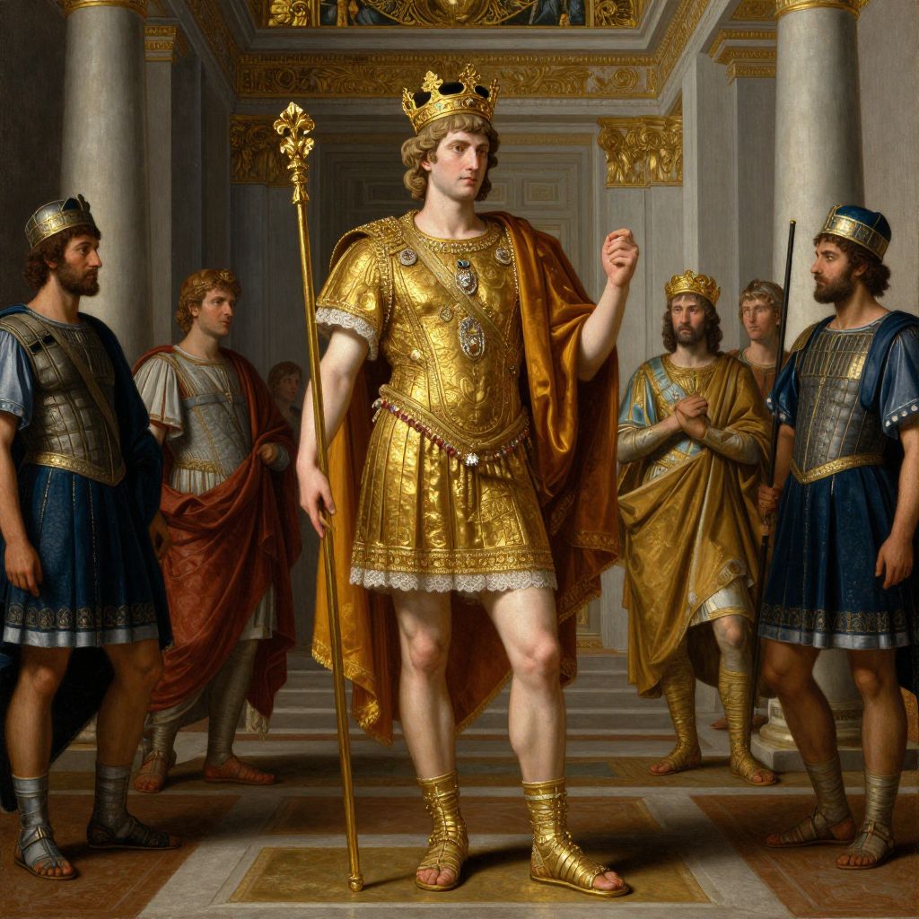 Portrait of Elagabalus in lavish golden palace interior, wearing a jeweled crown and holding a scepter, surrounded by Roman senators and guards, rich colors and textures, Renaissance oil painting style with chiaroscuro lighting