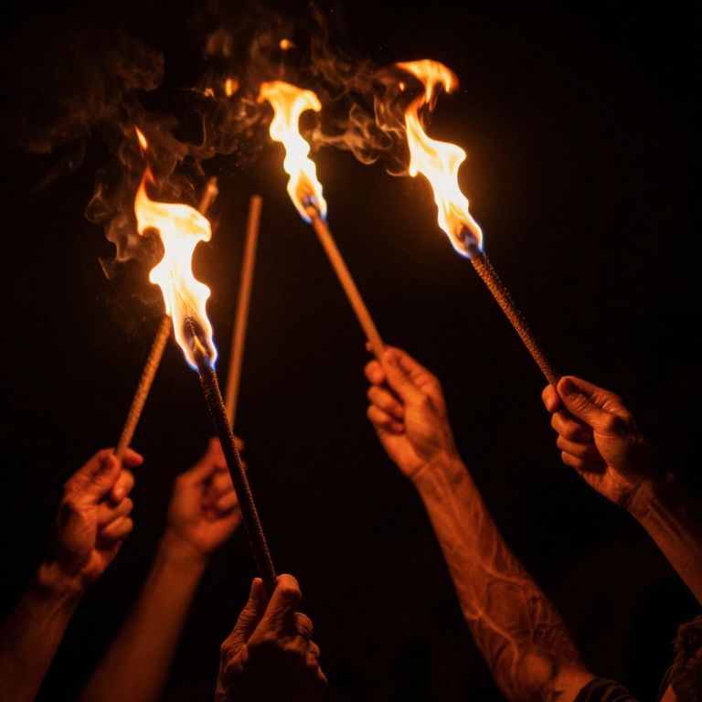 In the depths of a dark, void-like space, several hands emerge, each holding a flaming wand. The hands, with their intricate, veined textures, reach upwards, their forms slightly blurred, suggesting movement or a sense of urgency. The wands, glowing with an intense orange and yellow flame, are held at various angles, some pointing upwards, others angled to the side, creating a dynamic and somewhat chaotic arrangement. The background is a deep, almost black void, punctuated by the fiery glow of the wands, which stand out vividly against the darkness. The overall composition is one of tension and mystery, with the hands and wands seemingly in a state of flux, as if caught in a moment of intense action or revelation.