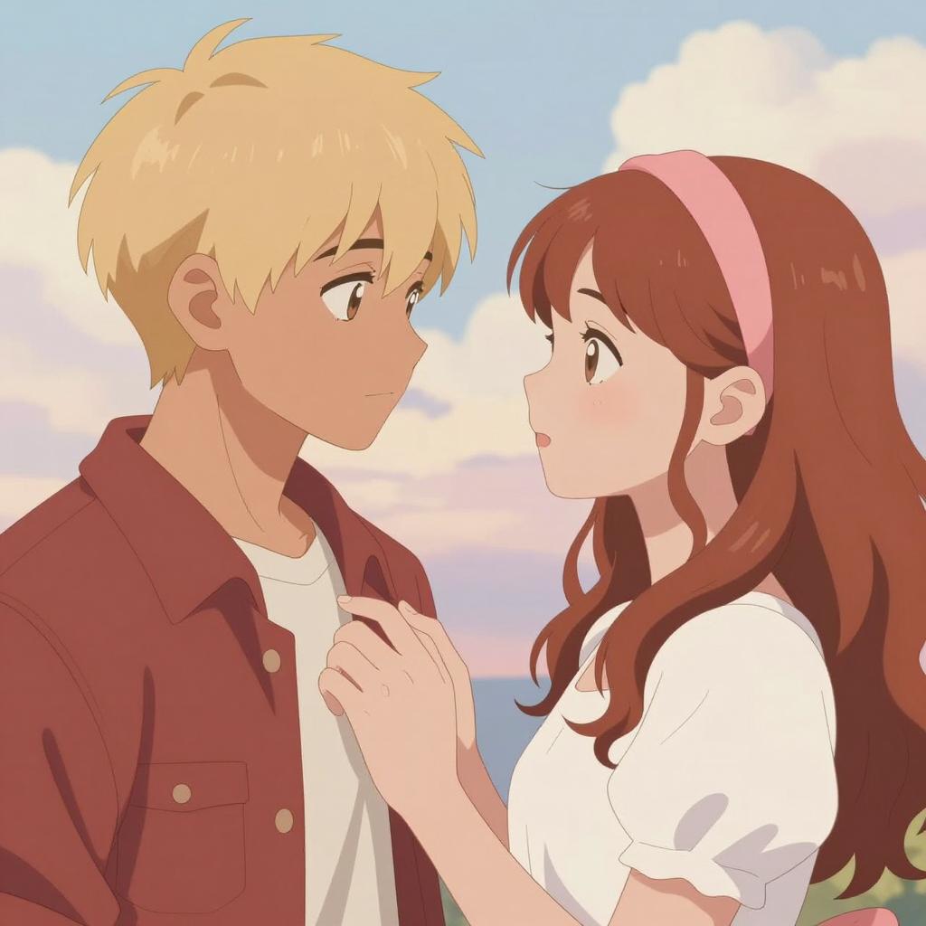 Digital illustration of two children sitting on a wooden bench outdoors. A blonde girl with large blue eyes, wearing a white shirt, denim shorts, and a pink and blue bow in her curly hair, gently kisses the cheek of a dark-haired boy with tousled hair. The boy wears a white shirt paired with blue denim overalls and white sneakers. Both children have soft expressions, with the boy's eyes closed and the girl smiling slightly. The background features a blurred, neutral wall with subtle green foliage.
