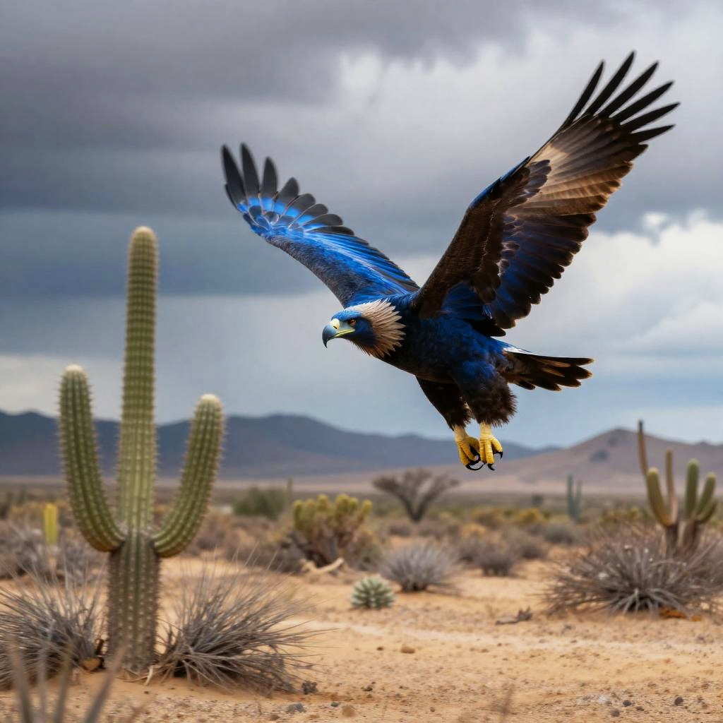 Futuristic blue desert eagle with cybernetic enhancements, flying low over cracked desert floor, neon blue lights glowing on feathers, sci-fi atmosphere, ultra detailed