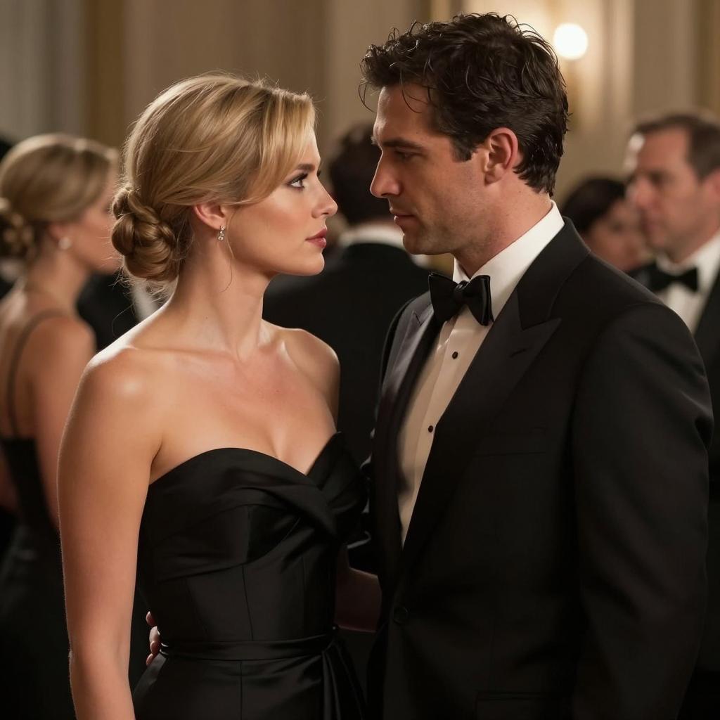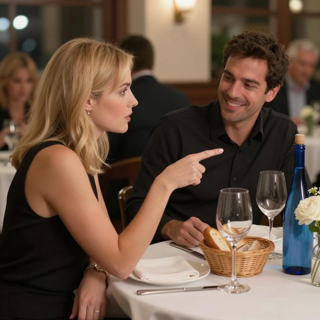 Photograph of a restaurant scene. Blonde woman with shoulder-length hair in a black sleeveless top, pointing at a man. Man with short dark hair, black shirt, smiling, seated across from her. Table with white cloth, wine glasses, bread basket, flowers, and a blue bottle. Background with dim lighting, other patrons. Woman's expression is intense, man's is smiling.