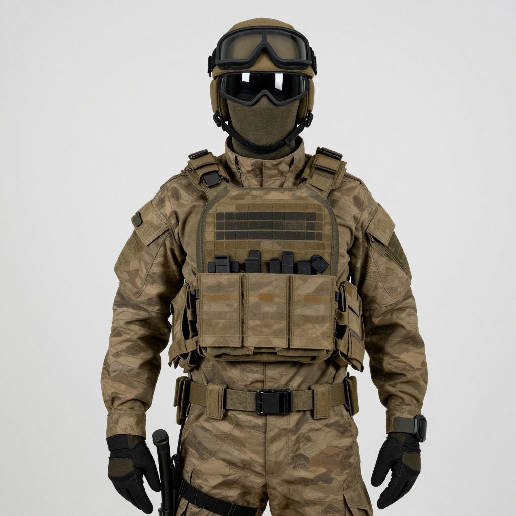 Photograph of a male soldier standing against a plain white background. He wears a full camouflage uniform with a tactical vest equipped with multiple pockets and a built-in radio. His face is covered by a black gas mask, and he has a black helmet with goggles. He also wears black gloves and has a holstered firearm on his right side. The uniform features various textures, including fabric and durable, rugged material. The overall appearance is functional and tactical. The image is sharply focused, highlighting the details of the gear and uniform.