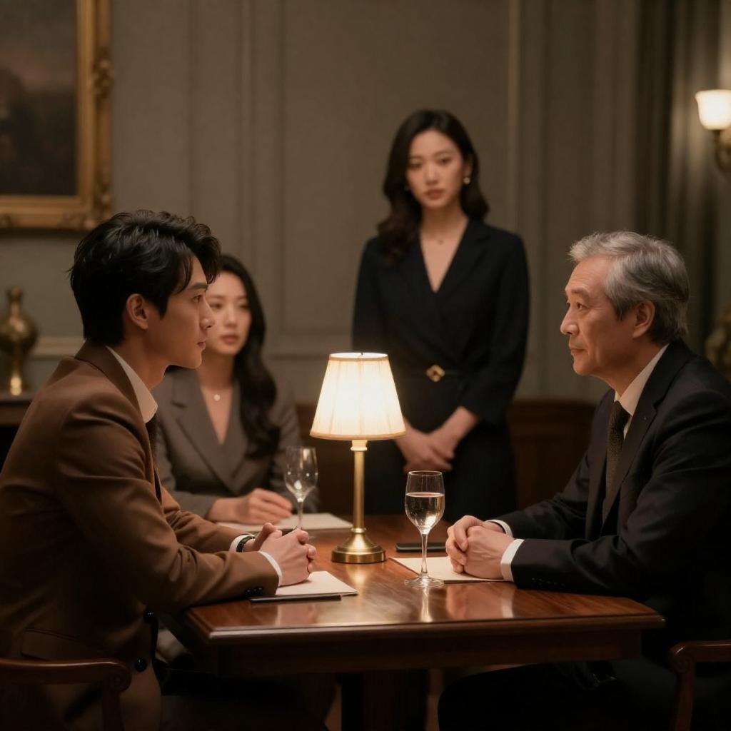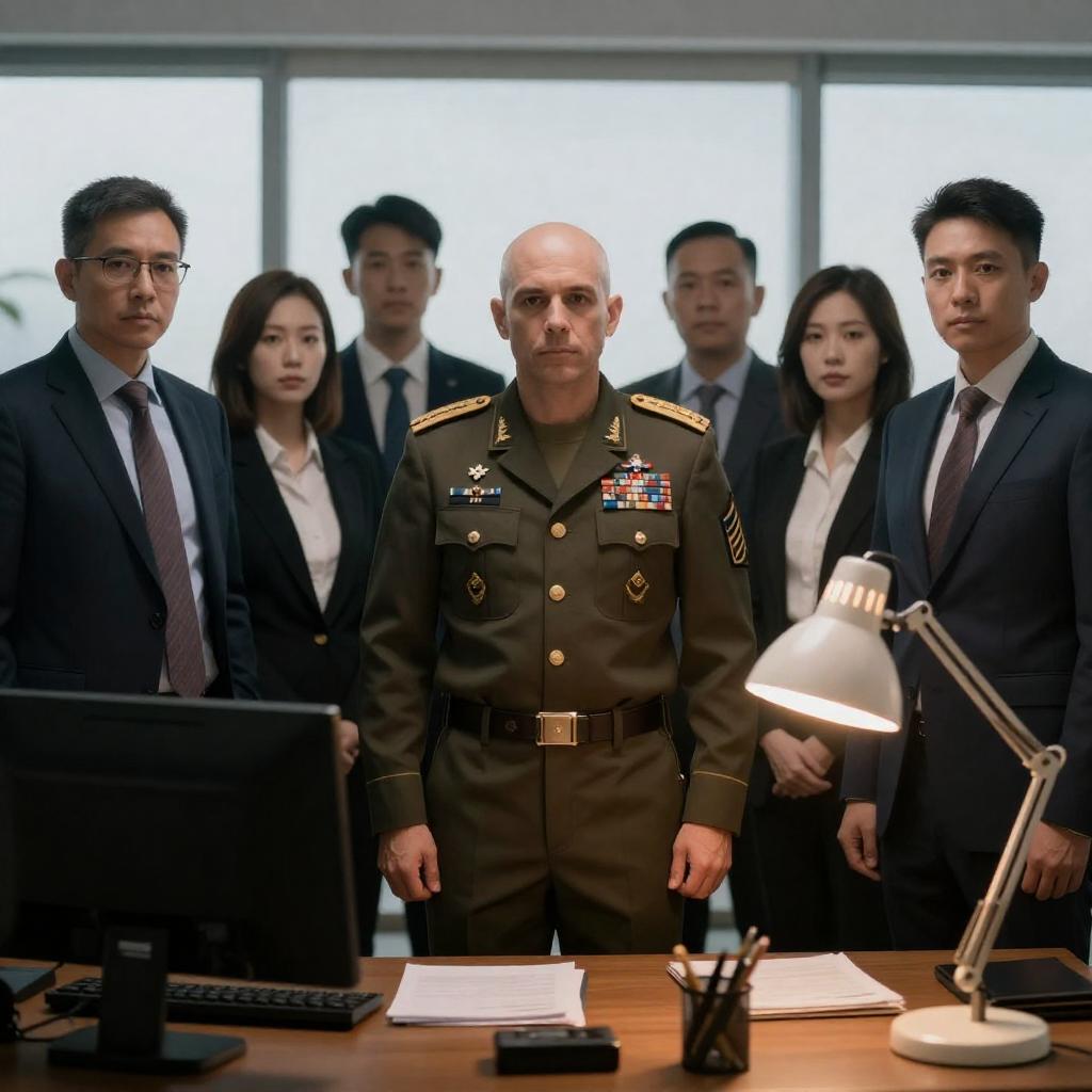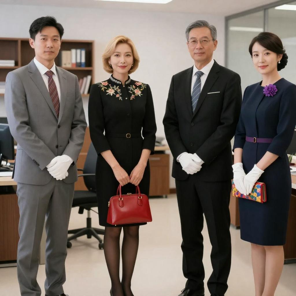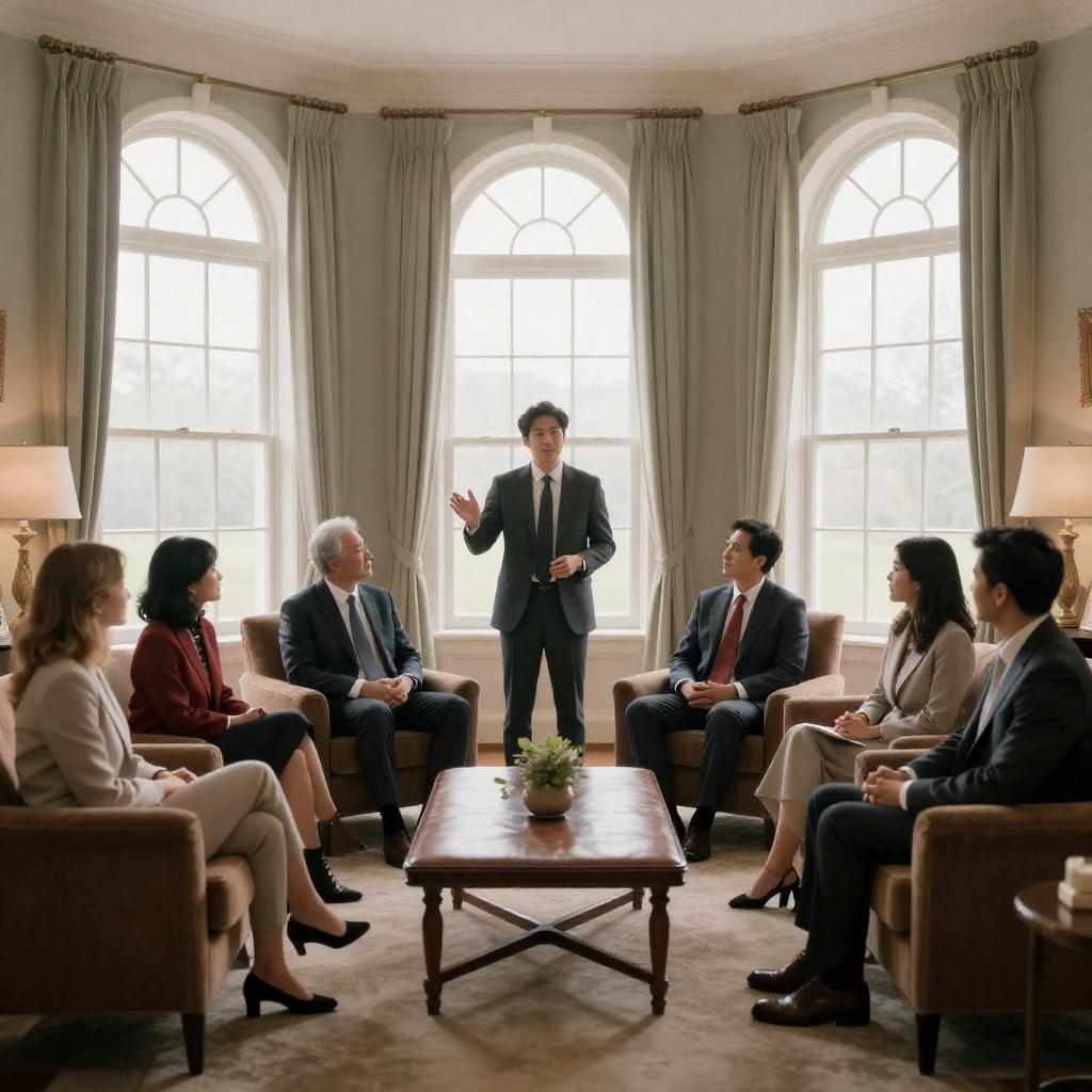 Photograph of a scene in a modern, dimly lit room with patterned wallpaper. Five women in professional attire stand in a semi-circle, facing a disheveled, bearded man in a dark robe, who stands near a white cylindrical object. Blue LED lights illuminate the background, and a vanity with a mirror and flowers is visible on the left.