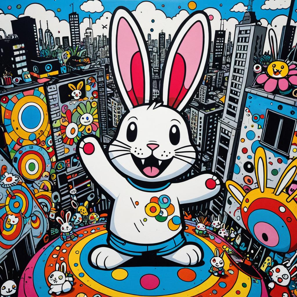 A colorful lowbrow graffiti-style painting of a large jovial white rabbit with pink ears and blue shorts, surrounded by psychedelic patterns and energetic whimsical details. The artwork is set on a vibrant city rooftop with high contrast colors, numerous smaller rabbits, smiling flowers, and bold circular motifs inspired by Takashi Murakami's style. The background features a dense urban skyline under a bright blue sky with cartoon clouds, creating a lively party-like atmosphere.