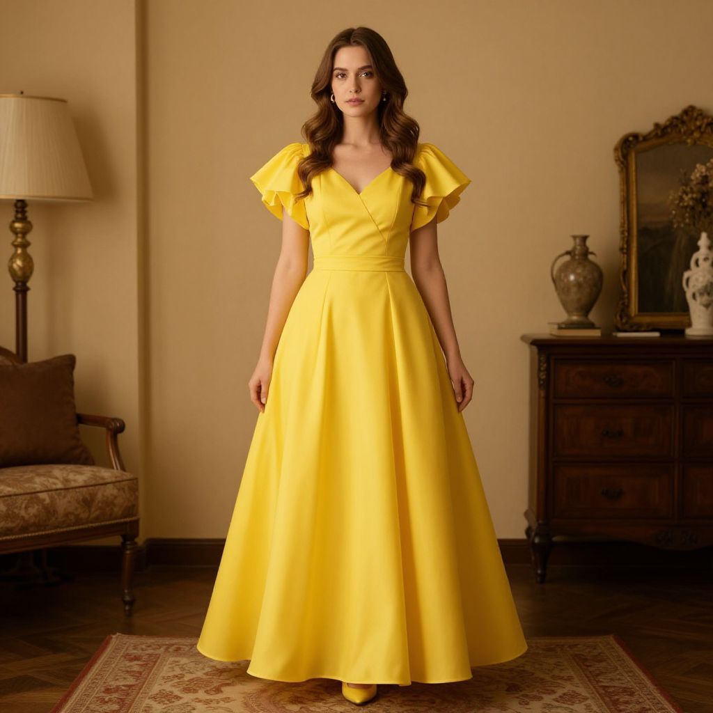"Woman Yellow Clothing Costume, a woman in a yellow dress standing in a room"