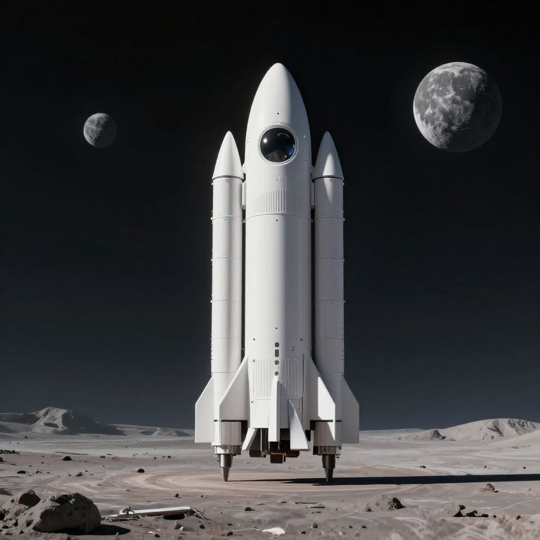 Photorealistic CGI of a white rocket standing on a lunar surface with two moons in the dark sky.