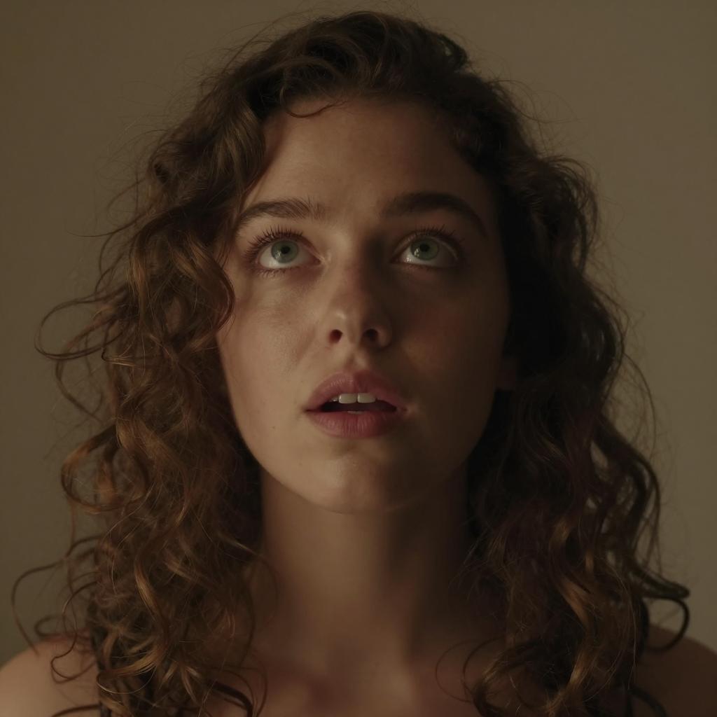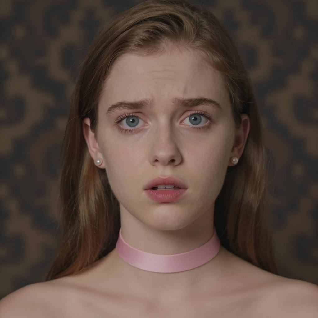 A young woman with fair skin and light brown hair, wearing small pearl earrings and a pink choker. She has wide blue eyes, slightly parted lips, and a concerned expression. Dark, patterned background. Face centered, hair on left side.