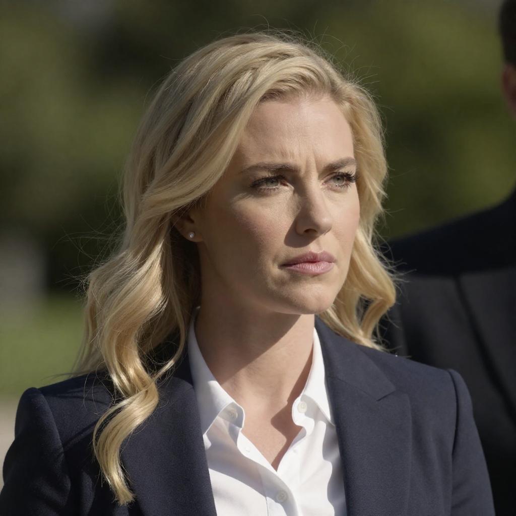 Photograph of a blonde woman in a black military uniform with gold buttons and white gloves, sitting and holding her hands in her lap. She has a serious expression and is looking to the left. An American flag is draped in the background, with dark wooden paneling behind her.