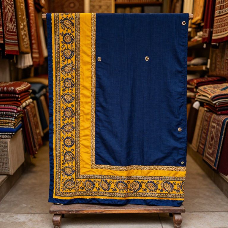 Photograph of a traditional Indian fabric displayed on a wooden stand in a store. The fabric features a rich navy blue field with intricate yellow borders adorned with paisley and floral patterns. The yellow border is wide and detailed, with smaller yellow and black decorative motifs along the edges. The fabric is slightly wrinkled, and four small silver buttons are evenly spaced on the upper right corner. Surrounding the display are various other colorful textiles stacked neatly against the walls. The store's floor is concrete, and the background is slightly blurred, focusing attention on the fabric.