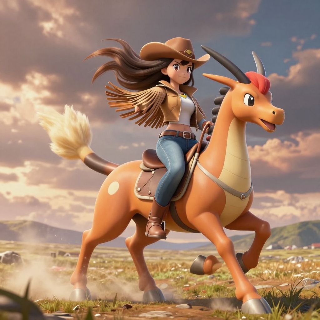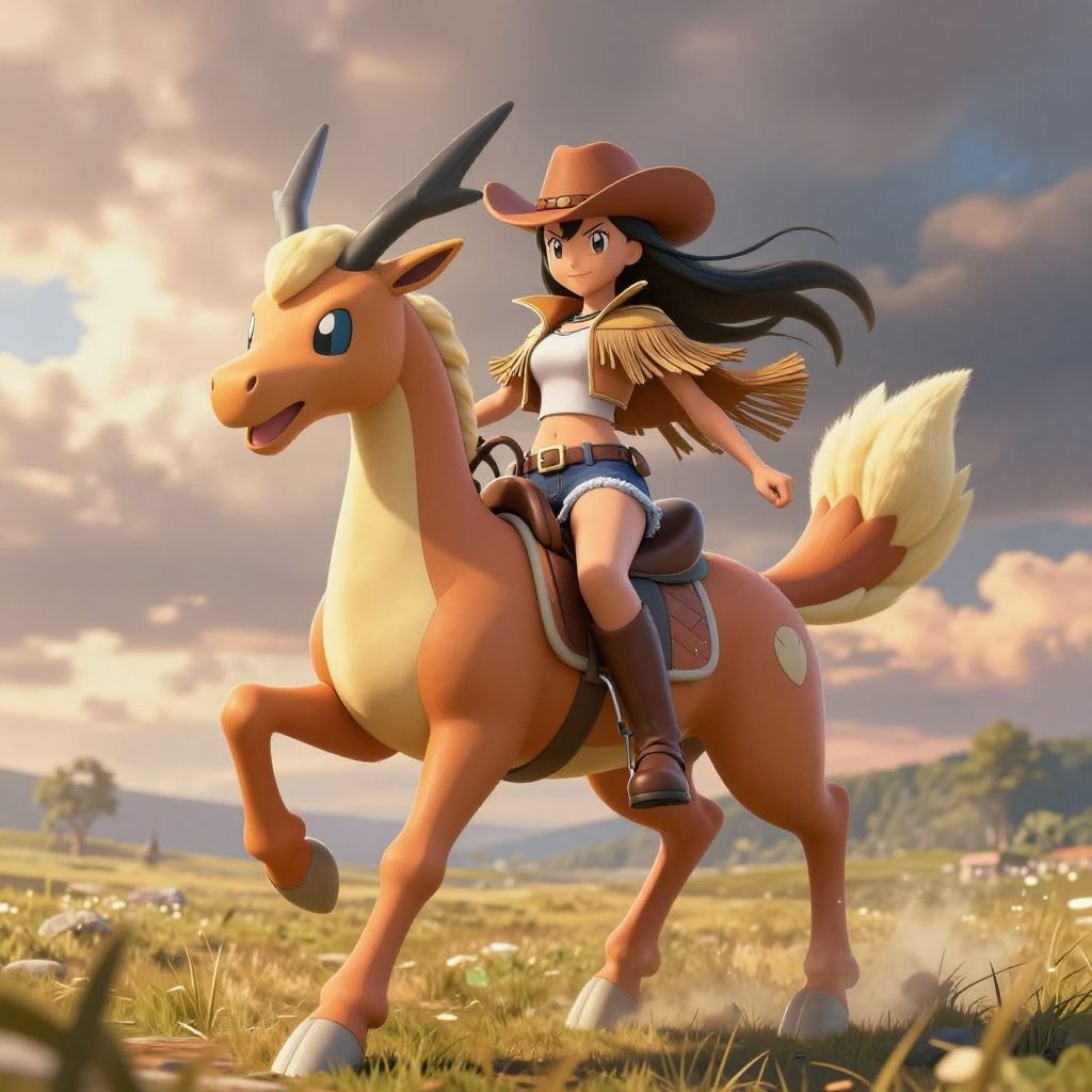 Pokemon cowgirl posing on a galloping Rapidash across open plains, dramatic sky, flowing hair and fringe jacket, warm color palette, highly detailed, dynamic movement