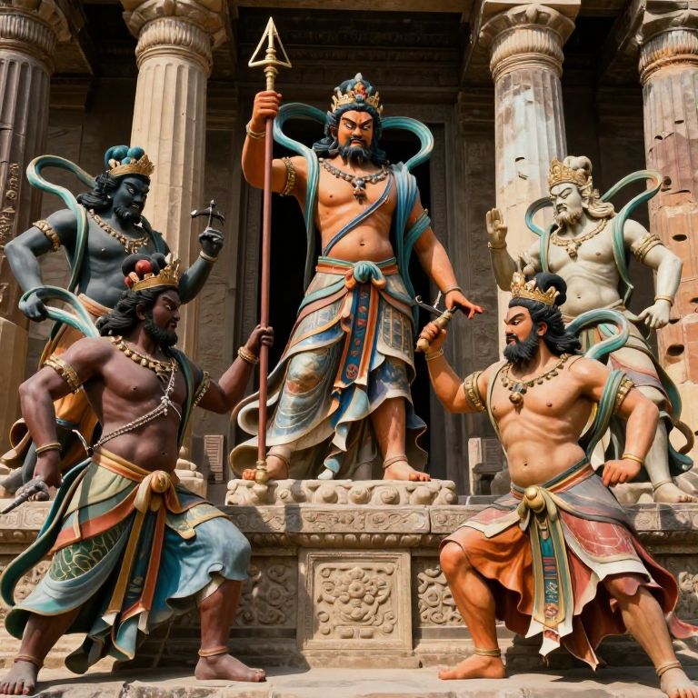 Punish theme through mythological punishment scenes, fierce gods or spirits meting out justice, vivid colors, dramatic poses, ancient temple ruins, epic storytelling style blending fantasy and realism.