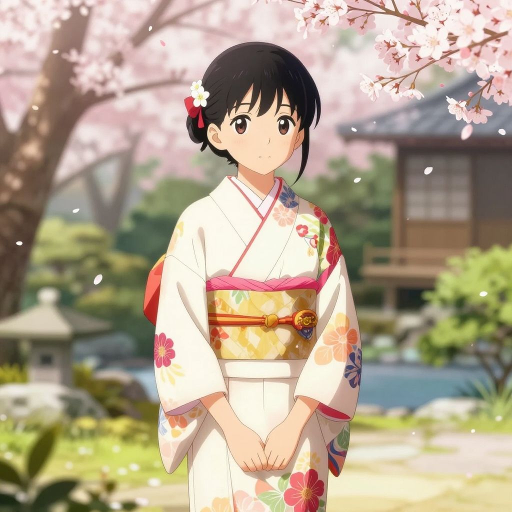 13 year old Japanese girl standing in a traditional garden, wearing a colorful kimono, cherry blossoms falling around her, soft sunlight, detailed and vibrant anime style