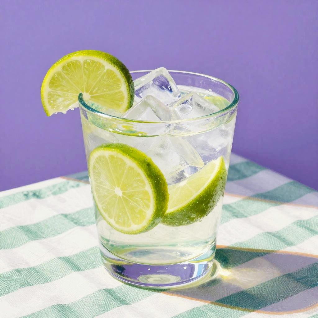 A bright, colorful digital painting of a clear glass filled with ice cubes and slices of lime, set against a purple background. The glass sits on a table covered with a green and white striped cloth. The sunlight creates sharp, contrasting shadows on the table, adding a playful and vibrant feel to the image.