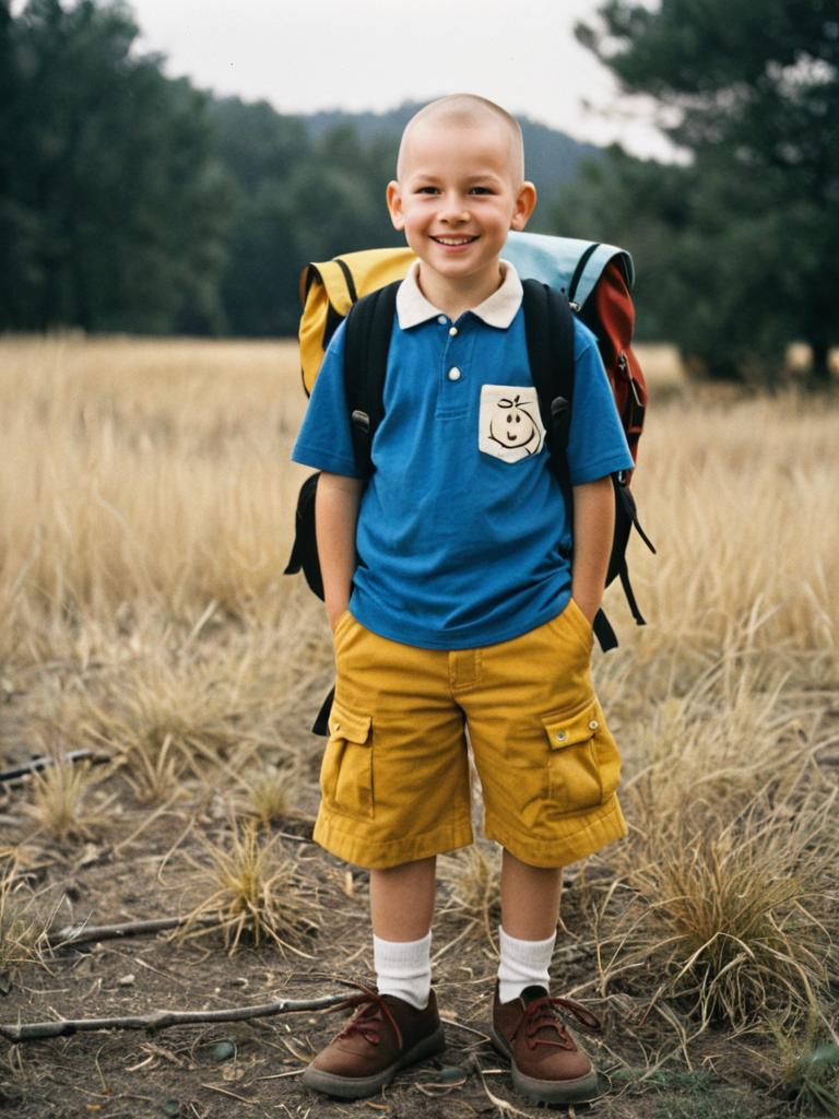 Kid paleontologist costume, blurry background, 1boy, blurry, male focus, solo, backpack, outdoors, hat, bag, day, looking at viewer, hands on own hips, goggles, shorts, shirt