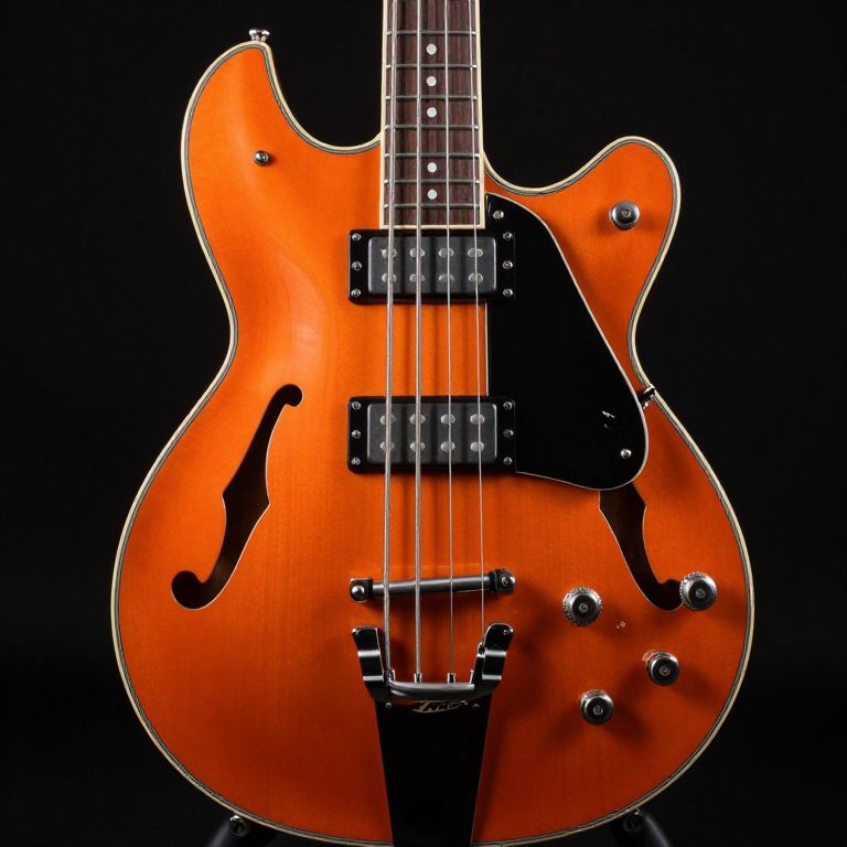 Gretsch Guitars' G5440LS Electromatic Long Scale Hollowbody Bass in vibrant orange showcases its sleek design with dual black pickguards, six silver tuning pegs, and a distinctive f-hole cutout, set against a stark black background.