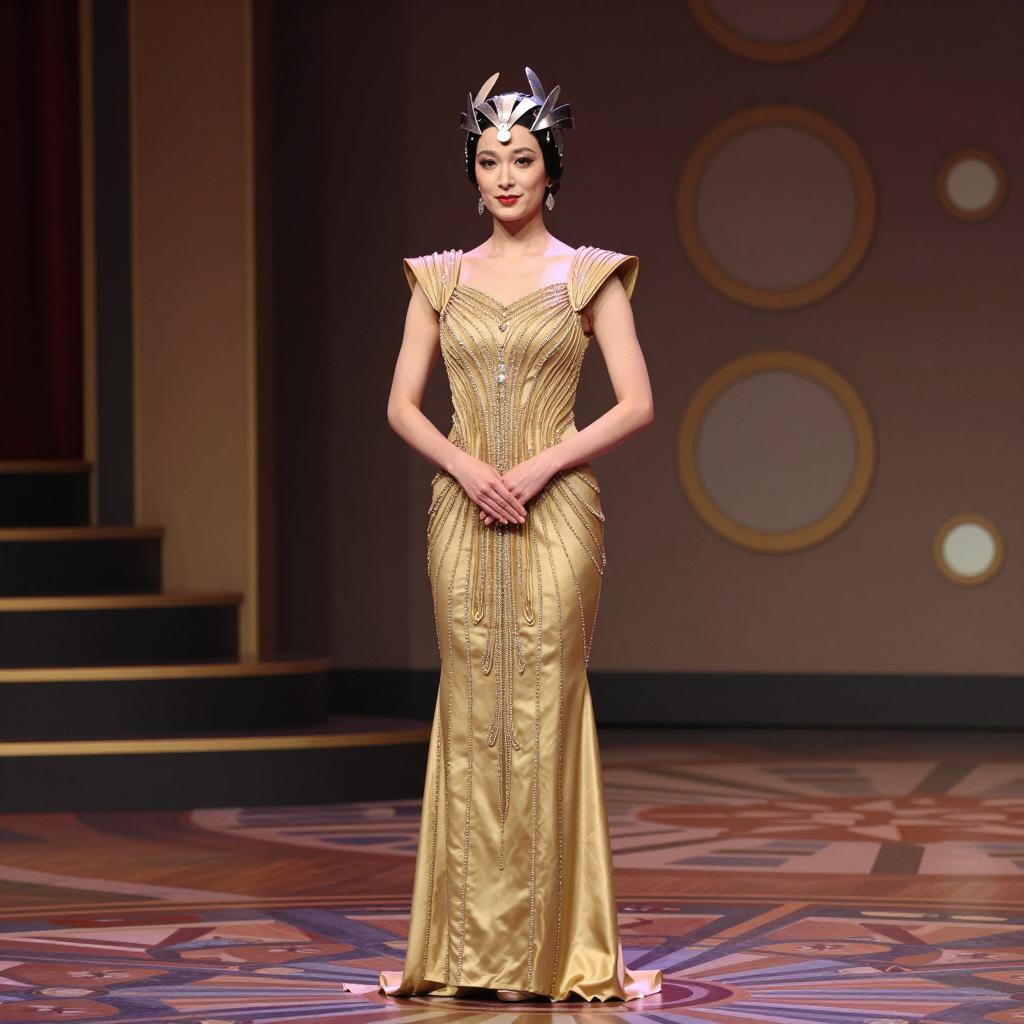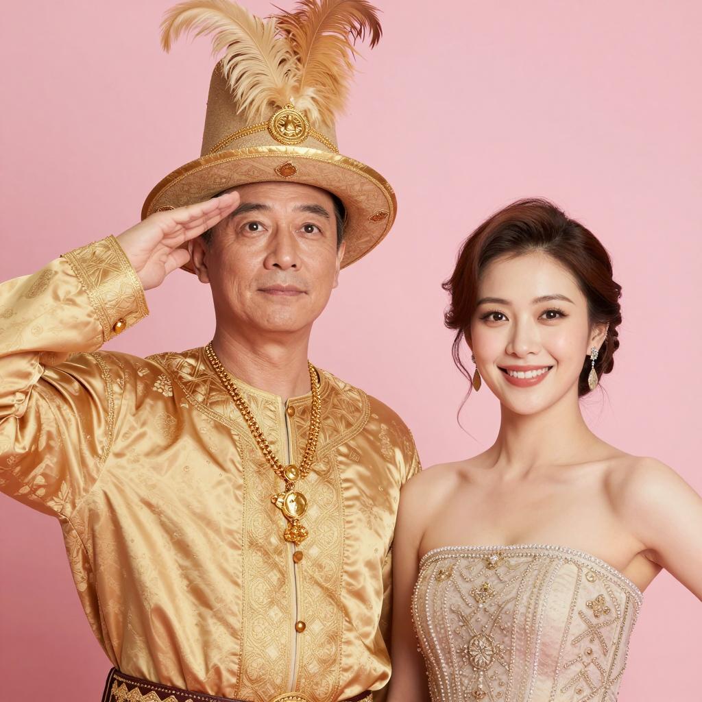 Two people on stage. Woman with short black hair, red lipstick, and beaded bra, left leg raised. Man in gold satin outfit, large hat, white gloves, hand on hat. Red velvet curtain background, spotlight on them.