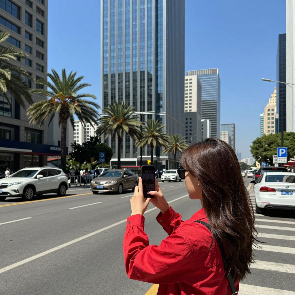 A woman with sunglasses and long hair wearing a red jacket standing on a busy urban street during bright daylight, holding a smartphone capturing the view of a tall modern skyscraper and surrounding cityscape, several cars on the road, palm trees along the walkway, clear blue sky, vibrant and realistic lighting, high detail on buildings and street elements
